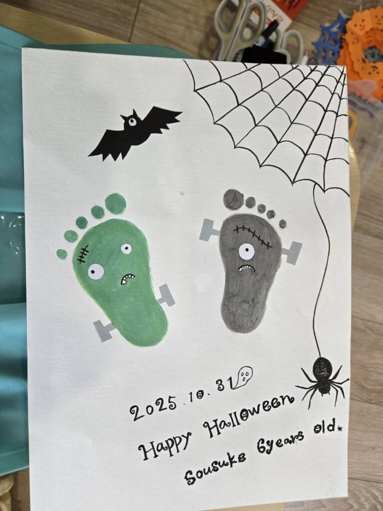 まず、足型を取って、足のサイズ測定をします。足型がかわいいハロウィンアートに大変身!